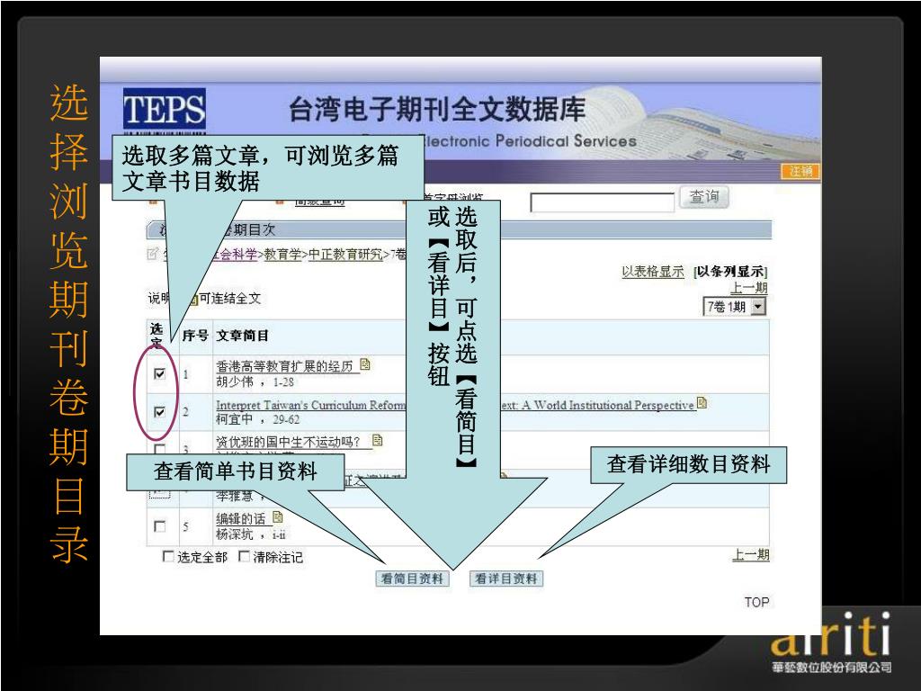 选择浏览期刊卷期目录 选取多篇文章,可浏览多篇文章书目数据 选取后,可点选【看简目】 或【看详目】按钮 查看详细数目资料 查看简单书目资料
