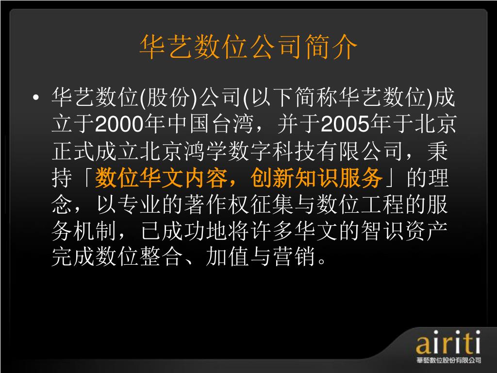 华艺数位公司简介 • 华艺数位(股份)公司(以下简称华艺数位)成立于2000年中国台湾,并于2005年于北京正式成立北京鸿学数字科技有限公司,秉持「数位华文内容,创新知识服务」的理念,以专业的著作权征集与数位工程的服务机制,已成功地将许多华文的智识资产完成数位整合、加值与营销。