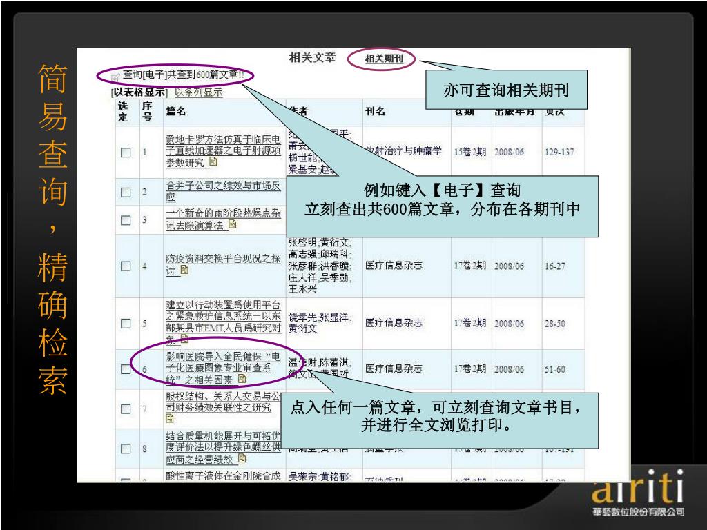 简易查询,精确检索 亦可查询相关期刊 例如键入【电子】查询 立刻查出共600篇文章,分布在各期刊中 点入任何一篇文章,可立刻查询文章书目,并进行全文浏览打印。