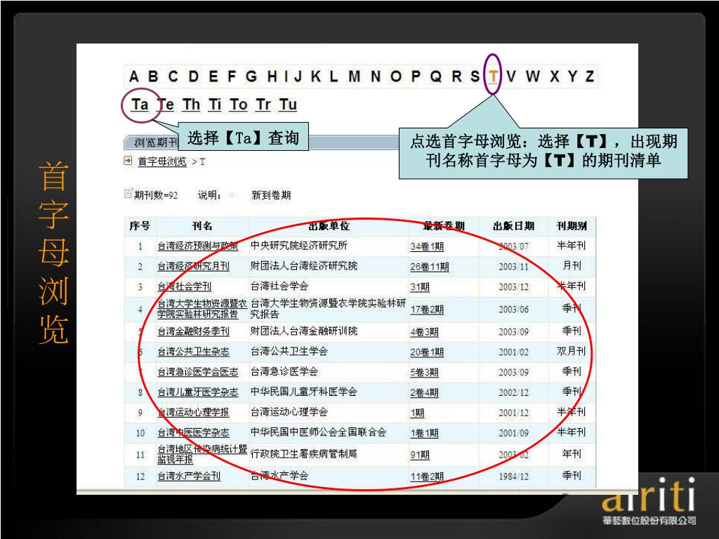 首字母浏览 选择【Ta】查询 点选首字母浏览:选择【T】,出现期刊名称首字母为【T】的期刊清单