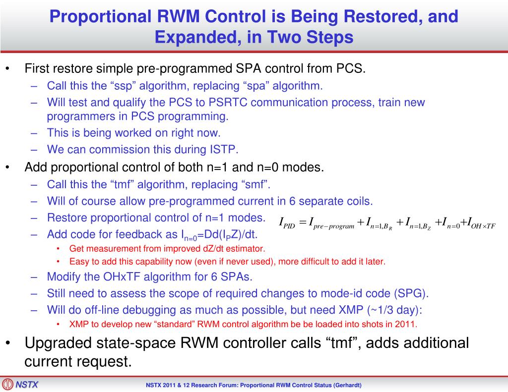 NSTX Supported by Commissioning The RWM Proportional Control Algorithms with Six Sub-Units College W&M Colorado Sch Mines Columbia U CompX General Atomics INL Johns Hopkins U LANL LLNL Lodestar MIT Nova Photonics New York U Old Dominion U ORNL PPPL PSI Princeton U Purdue U SNL Think Tank, Inc. UC Davis UC Irvine UCLA UCSD U Colorado U Illinois U Maryland U Rochester U Washington U Wisconsin Stefan Gerhardt CulhamSciCtr U St. Andrews York U Chubu U Fukui U Hiroshima U Hyogo U Kyoto U Kyushu U Kyushu Tokai U NIFS Niigata U U Tokyo JAEA Hebrew U Ioffe Inst RRC Kurchatov Inst TRINITI KBSI KAIST POSTECH ASIPP ENEA, Frascati CEA, Cadarache IPP, Jülich IPP, Garching ASCR, Czech Rep U Quebec 2011-12 NSTX Research Forum, ASC Session B318, PPPL Wednesday, March 16th
