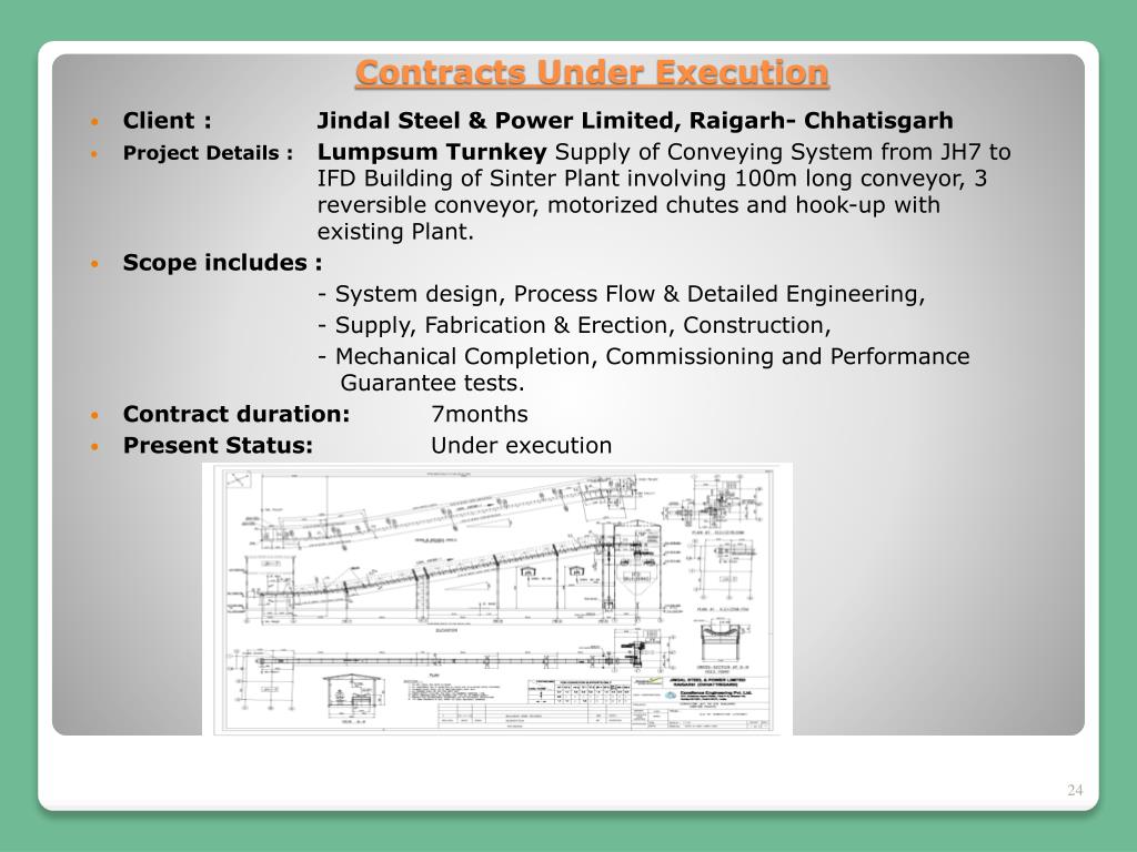 Client : Jindal Steel & Power Limited, Raigarh- Chhatisgarh • Project Details : Lumpsum Turnkey Supply of Conveying System from JH7 to IFD Building of Sinter Plant involving 100m long conveyor, 3 reversible conveyor, motorized chutes and hook-up with existing Plant. • Scope includes : - System design, Process Flow & Detailed Engineering, - Supply, Fabrication & Erection, Construction, - Mechanical Completion, Commissioning and Performance Guarantee tests. • Contract duration: 7months • Present Status: Under execution Contracts Under Execution