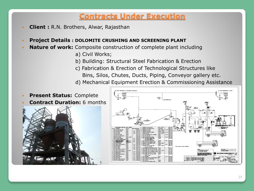 Client : R.N. Brothers, Alwar, Rajasthan • Project Details : DOLOMITE CRUSHING AND SCREENING PLANT • Nature of work: Composite construction of complete plant including a) Civil Works; b) Building: Structural Steel Fabrication & Erection c) Fabrication & Erection of Technological Structures like Bins, Silos, Chutes, Ducts, Piping, Conveyor gallery etc. d) Mechanical Equipment Erection & Commissioning Assistance • Present Status: Complete • Contract Duration: 6 months Contracts Under Execution