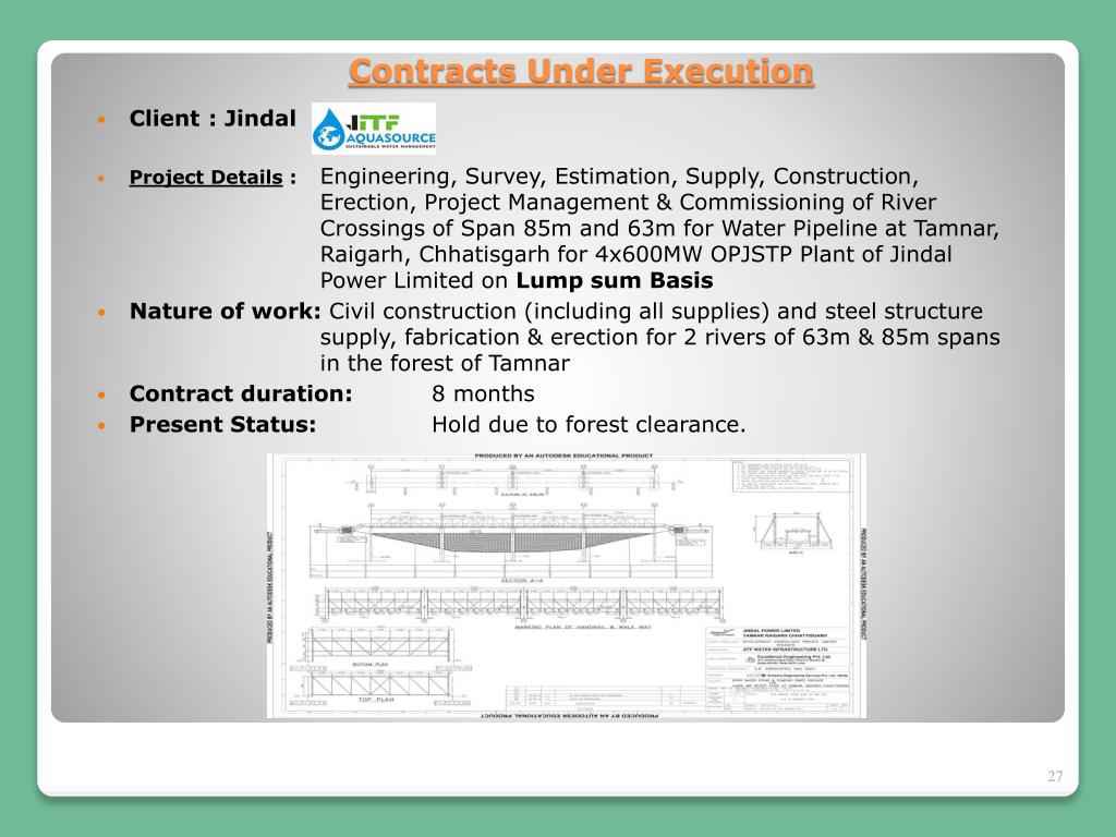 Client : Jindal • Project Details : Engineering, Survey, Estimation, Supply, Construction, Erection, Project Management & Commissioning of River Crossings of Span 85m and 63m for Water Pipeline at Tamnar, Raigarh, Chhatisgarh for 4x600MW OPJSTP Plant of Jindal Power Limited on Lump sum Basis • Nature of work: Civil construction (including all supplies) and steel structure supply, fabrication & erection for 2 rivers of 63m & 85m spans in the forest of Tamnar • Contract duration: 8 months • Present Status: Hold due to forest clearance. Contracts Under Execution
