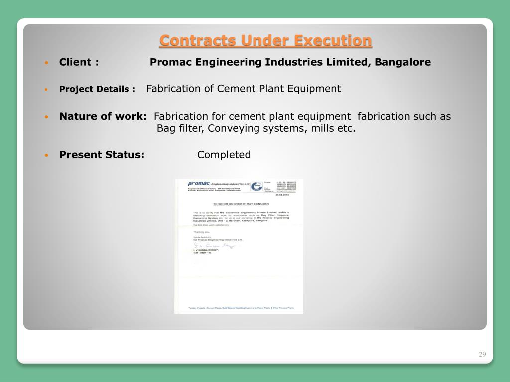 Client : Promac Engineering Industries Limited, Bangalore • Project Details : Fabrication of Cement Plant Equipment • Nature of work: Fabrication for cement plant equipment fabrication such as Bag filter, Conveying systems, mills etc. • Present Status: Completed Contracts Under Execution