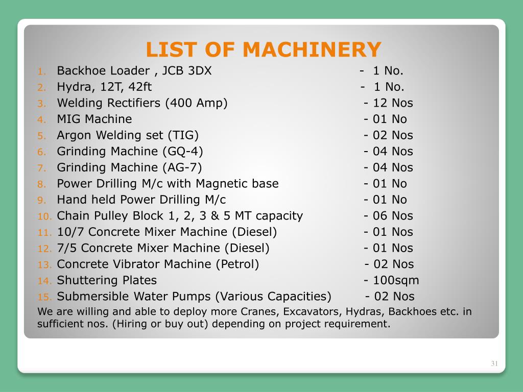 LIST OF MACHINERY • Backhoe Loader , JCB 3DX - 1 No. • Hydra, 12T, 42ft - 1 No. • Welding Rectifiers (400 Amp) - 12 Nos • MIG Machine - 01 No • Argon Welding set (TIG) - 02 Nos • Grinding Machine (GQ-4) - 04 Nos • Grinding Machine (AG-7) - 04 Nos • Power Drilling M/c with Magnetic base - 01 No • Hand held Power Drilling M/c - 01 No • Chain Pulley Block 1, 2, 3 & 5 MT capacity - 06 Nos • 10/7 Concrete Mixer Machine (Diesel) - 01 Nos • 7/5 Concrete Mixer Machine (Diesel) - 01 Nos • Concrete Vibrator Machine (Petrol) - 02 Nos • Shuttering Plates - 100sqm • Submersible Water Pumps (Various Capacities) - 02 Nos We are willing and able to deploy more Cranes, Excavators, Hydras, Backhoes etc. in sufficient nos. (Hiring or buy out) depending on project requirement.
