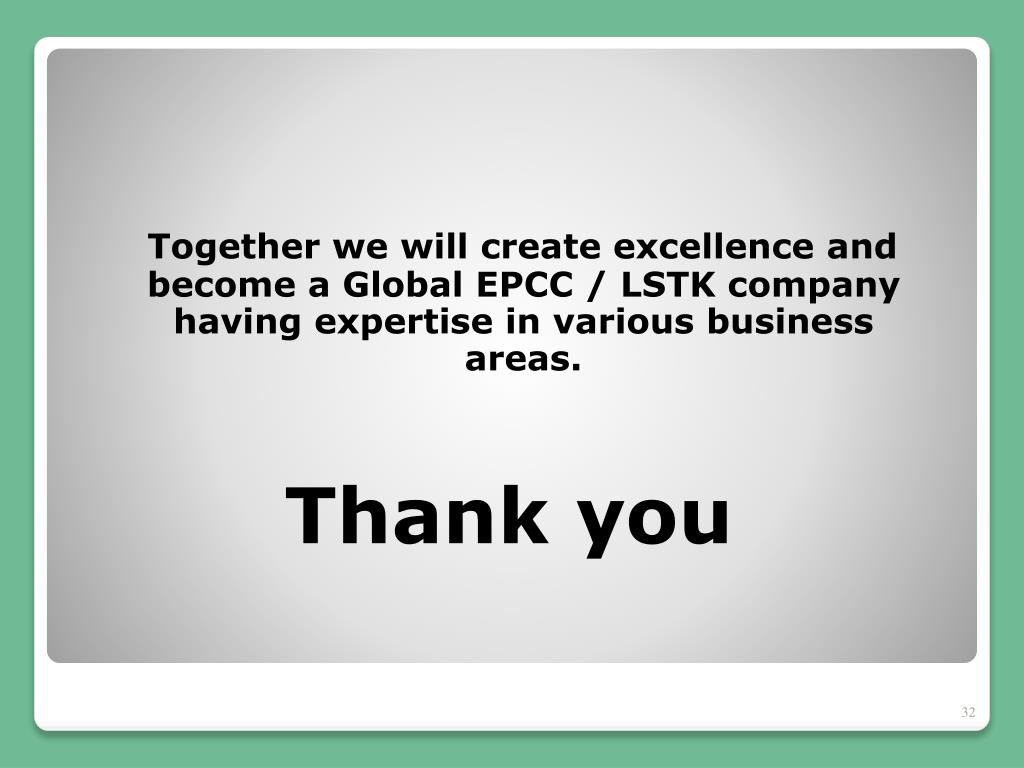 Together we will create excellence and become a Global EPCC / LSTK company having expertise in various business areas. Thank you