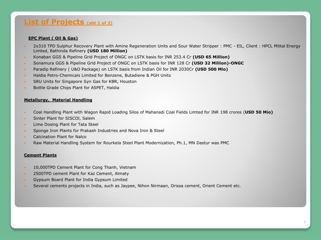 List of Projects (sht 1 of 2) EPC Plant ( Oil & Gas) • 2x310 TPD Sulphur Recovery Plant with Amine Regeneration Units and Sour Water Stripper : PMC - EIL, Client : HPCL Mittal Energy Limted, BathindaRefinery (USD 180 Million) • Konaban GGS & Pipeline Grid Project of ONGC on LSTK basis for INR 253.4 Cr (USD 65 Million) • Sonamura GGS & Pipeline Grid Project of ONGC on LSTK basis for INR 128 Cr (USD 32 Million)-ONGC • Paradip Refinery ( U&O Package) on LSTK basis from Indian Oil for INR 2030Cr (USD 500 Mio) • Haldia Petro-Chemicals Limited for Benzene, Butadiene & PGH Units • SRU Units for Singapore Syn Gas for KBR, Houston • Bottle Grade Chips Plant for ASPET, Haldia Metallurgy, Material Handling • Coal Handling Plant with Wagon Rapid Loading Silos of Mahanadi Coal Fields Limted for INR 198 crores (USD 50 Mio) • Sinter Plant for SISCOl, Salem • Lime Dosing Plant for Tata Steel • Sponge Iron Plants for Prakash Industries and Nova Iron & Steel • Calcination Plant for Nalco • Raw Material Handling System for Rourkela Steel Plant Modernization, Ph.1, MN Dastur was PMC Cement Plants • 10,000TPD Cement Plant for Cong Thanh, Vietnam • 2500TPD cement Plant for Kaz Cement, Almaty • Gypsum Board Plant for India Gypsum Limited • Several cements projects in India, such as Jaypee, Nihon Nirmaan, Orissa cement, Orient Cement etc.
