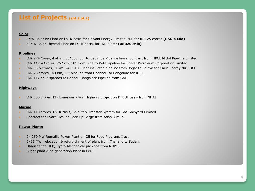 List of Projects (sht 2 of 2) Solar • 2MW Solar PV Plant on LSTK basis for Shivani Energy Limited, M.P for INR 25 crores(USD 4 Mio) • 50MW Solar Thermal Plant on LSTK basis, for INR 800cr (USD200Mio) Pipelines • INR 274 Cores, 474km, 30" Jodhpur to Bathinda Pipeline laying contract from HPCL Mittal Pipeline Limited • INR 117.4 Crores, 257 km, 18" from Bina to Kota Pipeline for Bharat Petroleum Corporation Limited • INR 55.6 crores, 50km, 24+1+8" Heat insulated pipeline from Bogat to Salaya for Cairn Energy thru L&T • INR 28 crores,143 km, 12" pipeline from Chennai -to Bangalore for IOCL • INR 112 cr, 2 spreads of Dabhol- Bangalore Pipeline from GAIL Highways • INR 500 crores, Bhubaneswar - Puri Highway project on DFBOT basis from NHAI Marine • INR 110 crores, LSTK basis, Shiplift & Transfer System for Goa Shipyard Limited • Contract for Hydraulics of Jack-up Barge from Adani Group. Power Plants • 2x 250 MW Rumailla Power Plant on Oil for Food Program, Iraq. • 2x65 MW, relocation & refurbishment of plant from Thailand to Sudan. • Dhauliganga HEP, Hydro-Mechanical package from NHPC. • Sugar plant & co-generation Plant in Peru.