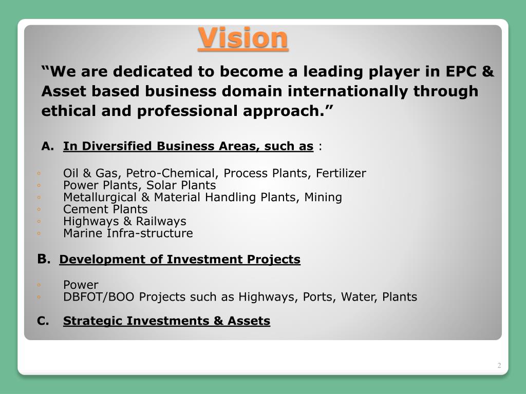 “We are dedicated to become a leading player in EPC & Asset based business domain internationally through ethical and professional approach.” A. In Diversified Business Areas, such as : • Oil & Gas, Petro-Chemical, Process Plants, Fertilizer • Power Plants, Solar Plants • Metallurgical & Material Handling Plants, Mining • Cement Plants • Highways & Railways • Marine Infra-structure B. Development of Investment Projects • Power • DBFOT/BOO Projects such as Highways, Ports, Water, Plants C. Strategic Investments & Assets Vision