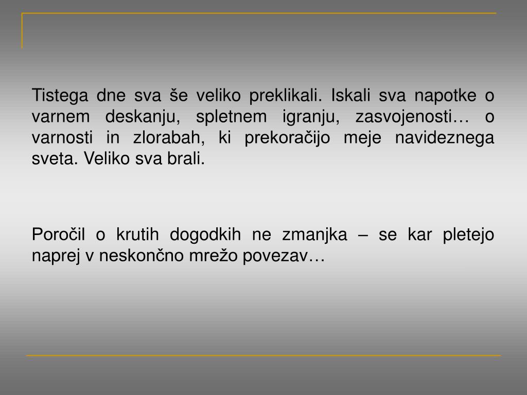 Tistega dne sva še veliko preklikali. Iskali sva napotke o varnem deskanju, spletnem igranju, zasvojenosti… o varnosti in zlorabah, ki prekoračijo meje navideznega sveta. Veliko sva brali. Poročil o krutih dogodkih ne zmanjka – se kar pletejo naprej v neskončno mrežo povezav…