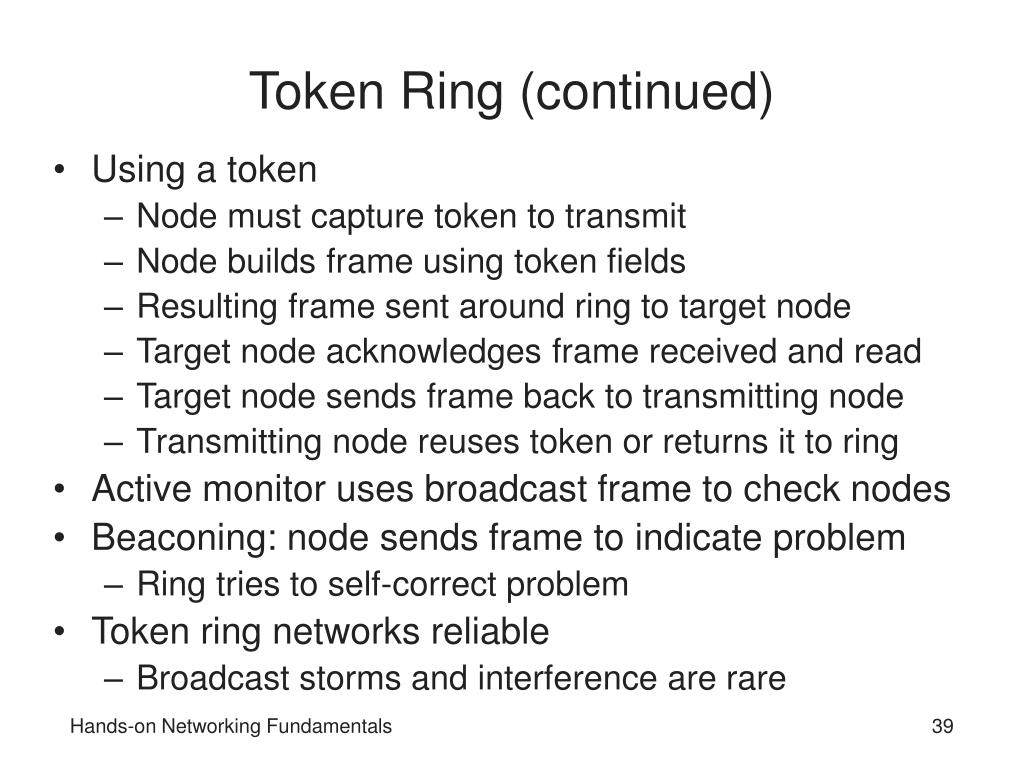 Token Ring (continued) • Using a token • Node must capture token to transmit • Node builds frame using token fields • Resulting frame sent around ring to target node • Target node acknowledges frame received and read • Target node sends frame back to transmitting node • Transmitting node reuses token or returns it to ring • Active monitor uses broadcast frame to check nodes • Beaconing: node sends frame to indicate problem • Ring tries to self-correct problem • Token ring networks reliable • Broadcast storms and interference are rare Hands-on Networking Fundamentals