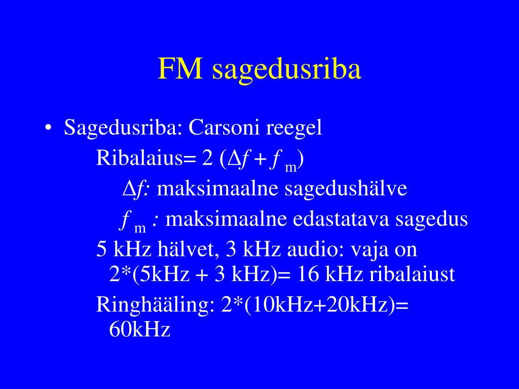 FM sagedusriba • Sagedusriba: Carsoni reegel Ribalaius= 2 (Δf + fm) Δf: maksimaalne sagedushälve fm : maksimaalne edastatava sagedus 5 kHz hälvet, 3 kHz audio: vaja on 2*(5kHz + 3 kHz)= 16 kHz ribalaiust Ringhääling: 2*(10kHz+20kHz)= 60kHz