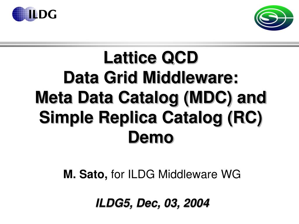 Lattice QCD Data Grid Middleware:Meta Data Catalog (MDC) andSimple Replica Catalog (RC)Demo M. Sato, for ILDG Middleware WG ILDG5, Dec, 03, 2004