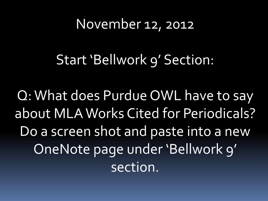November 12, 2012 Start ‘Bellwork 9’ Section: Q: What does Purdue OWL have to say about MLA Works Cited for Periodicals? Do a screen shot and paste into a new OneNote page under ‘Bellwork 9’ section.