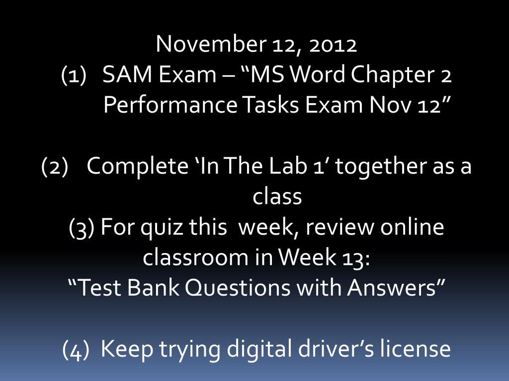 November 12, 2012 SAM Exam – “MS Word Chapter 2 Performance Tasks Exam Nov 12” Complete ‘In The Lab 1’ together as a class (3) For quiz this week, review online classroom in Week 13: “Test Bank Questions with Answers” (4) Keep trying digital driver’s license