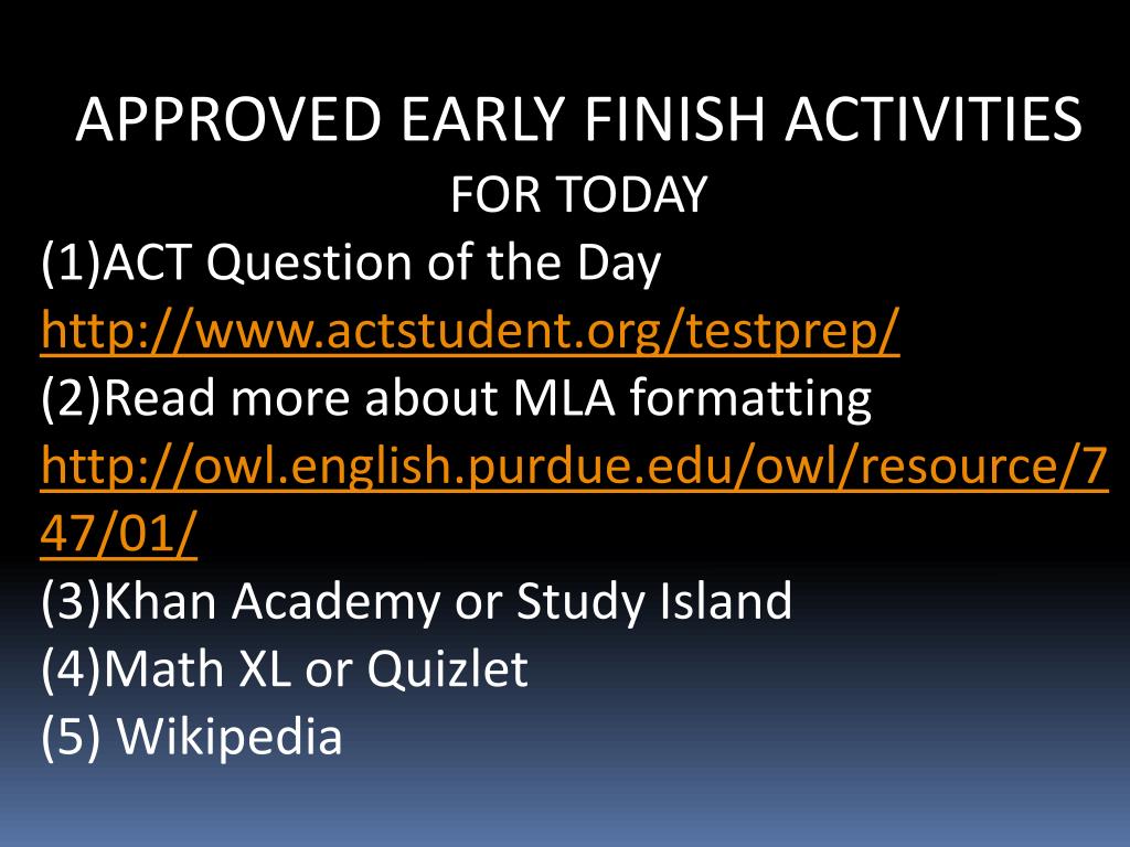APPROVED EARLY FINISH ACTIVITIES FOR TODAY • (1)ACT Question of the Day • http://www.actstudent.org/testprep/ • (2)Read more about MLA formatting http://owl.english.purdue.edu/owl/resource/747/01/ • (3)Khan Academy or Study Island • (4)Math XL or Quizlet • (5) Wikipedia