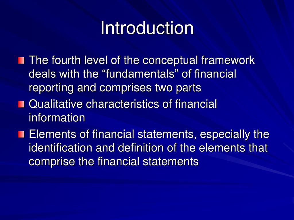 Introduction • The fourth level of the conceptual framework deals with the “fundamentals” of financial reporting and comprises two parts • Qualitative characteristics of financial information • Elements of financial statements, especially the identification and definition of the elements that comprise the financial statements