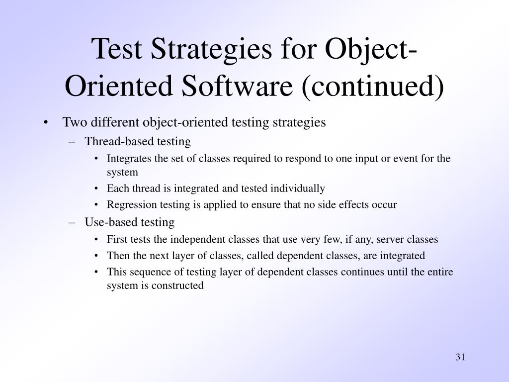 Test Strategies for Object-Oriented Software (continued) • Two different object-oriented testing strategies • Thread-based testing • Integrates the set of classes required to respond to one input or event for the system • Each thread is integrated and tested individually • Regression testing is applied to ensure that no side effects occur • Use-based testing • First tests the independent classes that use very few, if any, server classes • Then the next layer of classes, called dependent classes, are integrated • This sequence of testing layer of dependent classes continues until the entire system is constructed