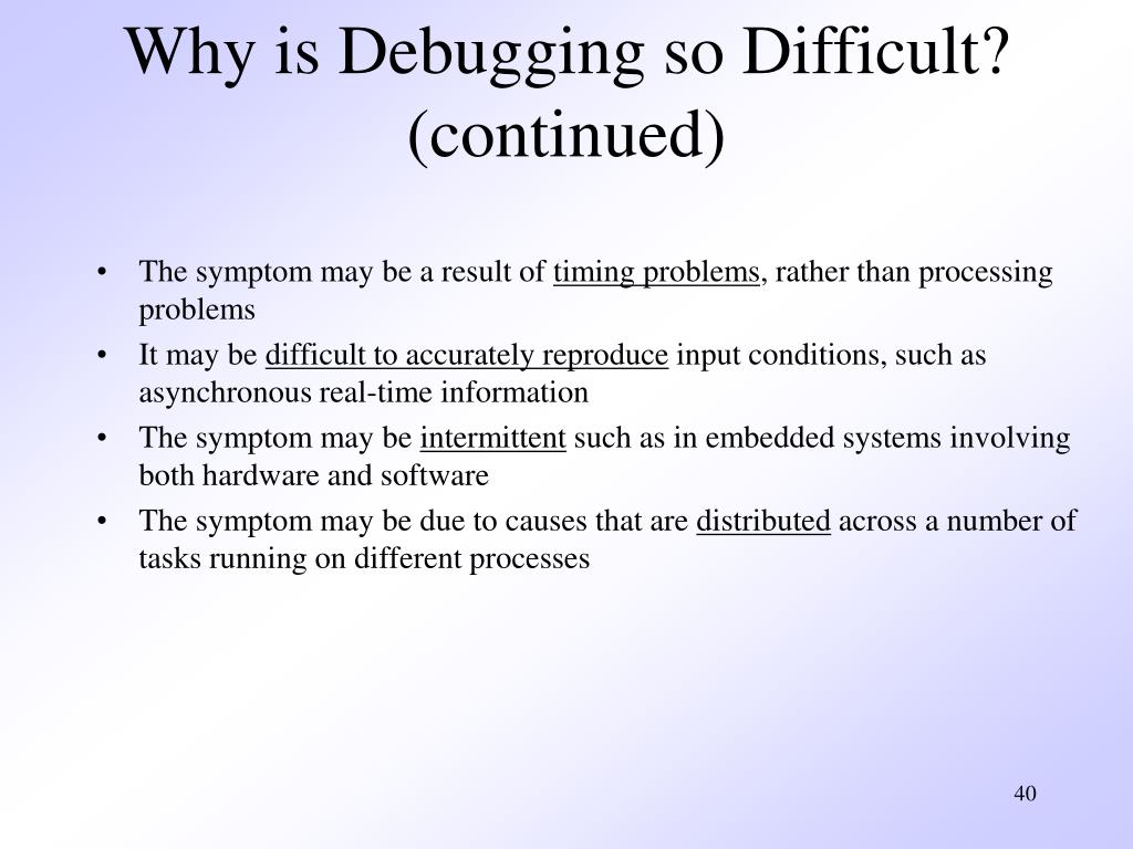 Why is Debugging so Difficult?(continued) • The symptom may be a result of timing problems, rather than processing problems • It may be difficult to accurately reproduce input conditions, such as asynchronous real-time information • The symptom may be intermittent such as in embedded systems involving both hardware and software • The symptom may be due to causes that are distributed across a number of tasks running on different processes