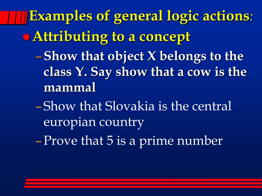Examples of general logic actions: • Attributing to a concept • Show that object X belongs to the class Y. Say show that a cow is the mammal • Show that Slovakia is the central europian country • Prove that 5 is a prime number