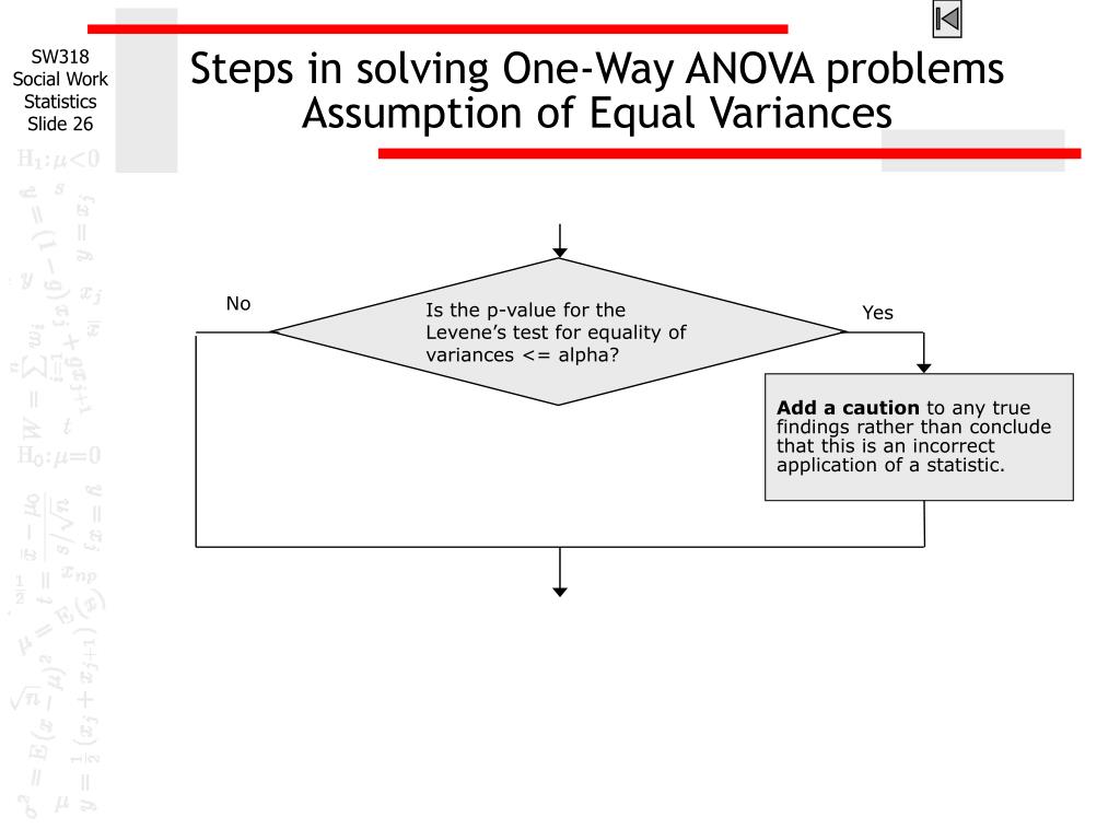 Steps in solving One-Way ANOVA problemsAssumption of Equal Variances Is the p-value for the Levene’s test for equality of variances <= alpha? No Yes Add a caution to any true findings rather than conclude that this is an incorrect application of a statistic.