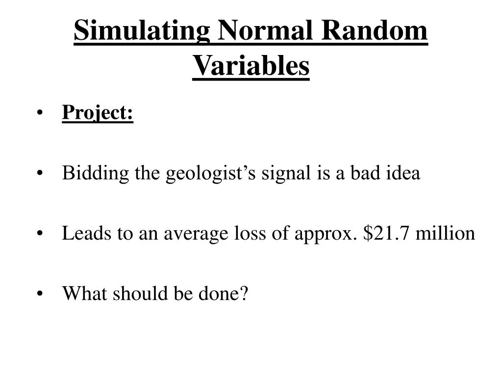 Simulating Normal Random Variables • Project: • Bidding the geologist’s signal is a bad idea • Leads to an average loss of approx. $21.7 million • What should be done?