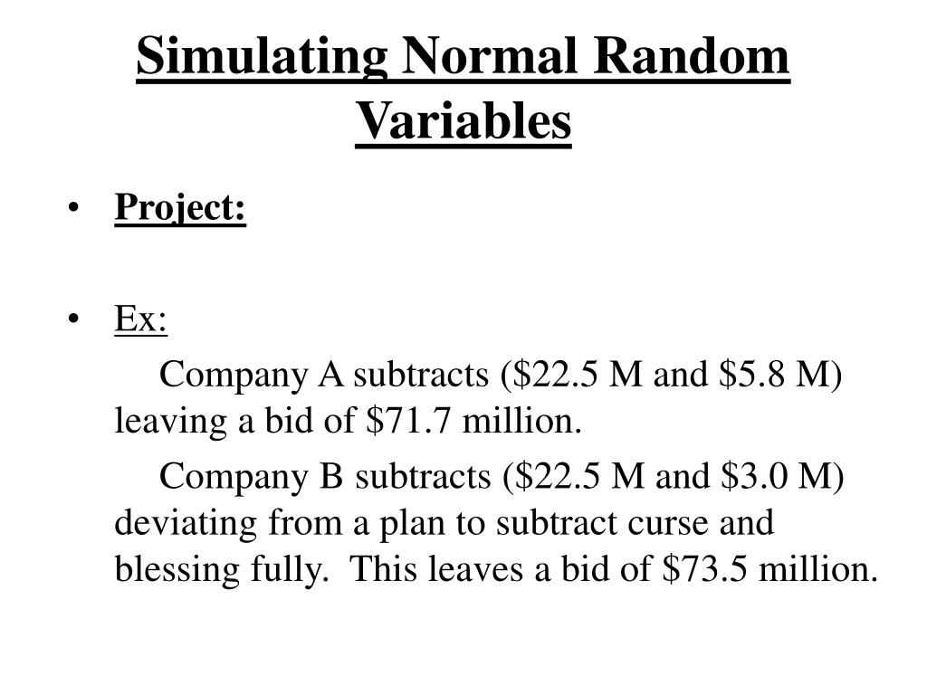 Simulating Normal Random Variables • Project: • Ex: Company A subtracts ($22.5 M and $5.8 M) leaving a bid of $71.7 million. Company B subtracts ($22.5 M and $3.0 M) deviating from a plan to subtract curse and blessing fully. This leaves a bid of $73.5 million.