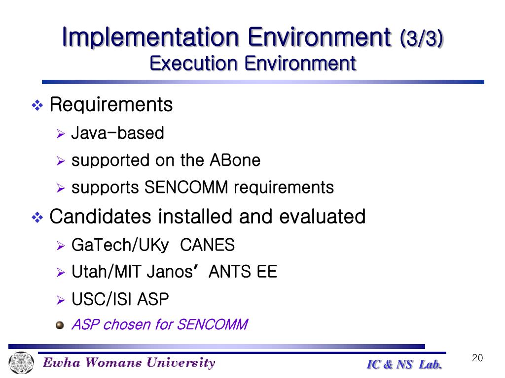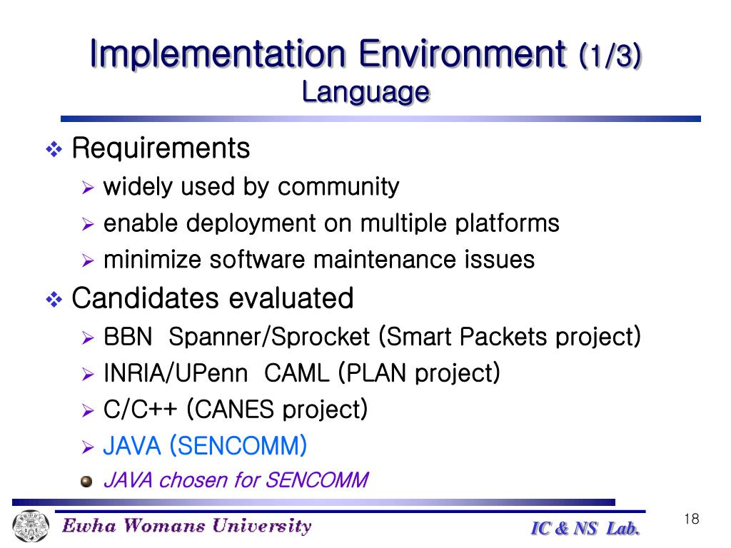 Implementation Environment (1/3)Language • Requirements • widely used by community • enable deployment on multiple platforms • minimize software maintenance issues • Candidates evaluated • BBN Spanner/Sprocket (Smart Packets project) • INRIA/UPenn CAML (PLAN project) • C/C++ (CANES project) • JAVA (SENCOMM) • JAVA chosen for SENCOMM