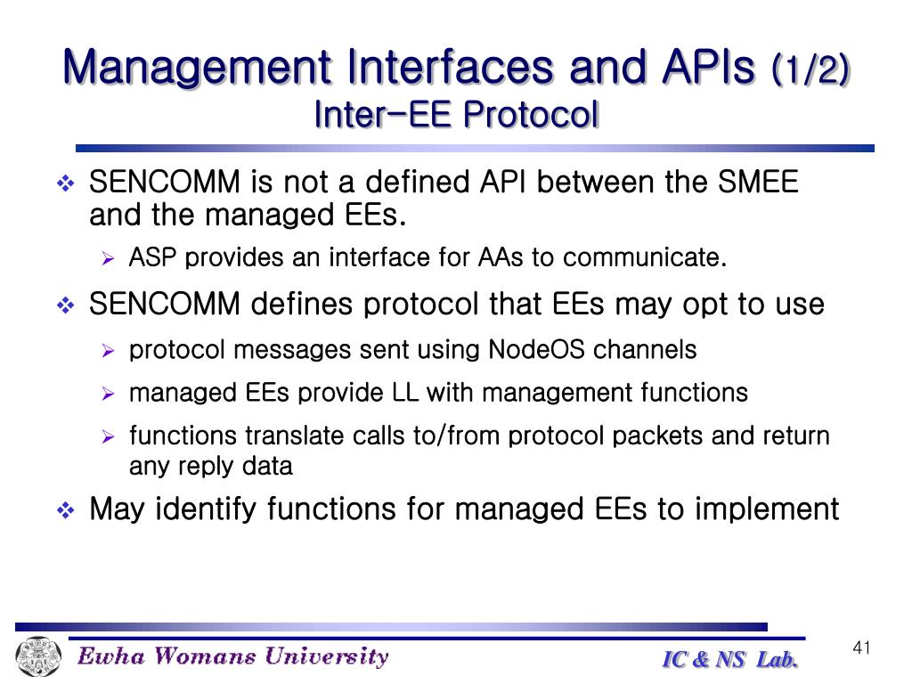 Management Interfaces and APIs (1/2)Inter-EE Protocol • SENCOMM is not a defined API between the SMEE and the managed EEs. • ASP provides an interface for AAs to communicate. • SENCOMM defines protocol that EEs may opt to use • protocol messages sent using NodeOS channels • managed EEs provide LL with management functions • functions translate calls to/from protocol packets and return any reply data • May identify functions for managed EEs to implement