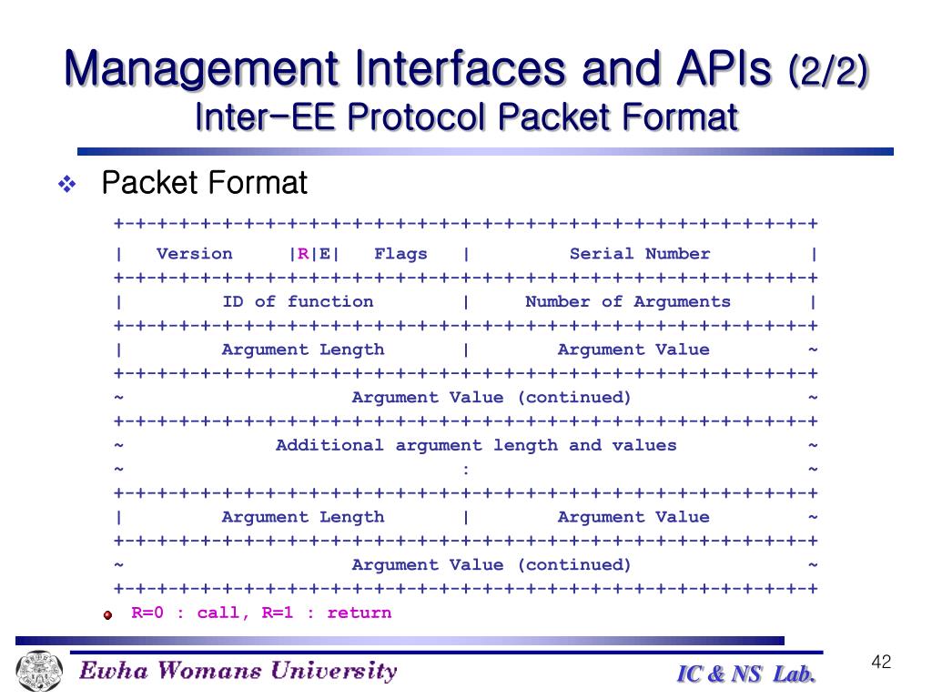 Management Interfaces and APIs (2/2)Inter-EE Protocol Packet Format • Packet Format +-+-+-+-+-+-+-+-+-+-+-+-+-+-+-+-+-+-+-+-+-+-+-+-+-+-+-+-+-+-+-+-+ | Version |R|E| Flags | Serial Number | +-+-+-+-+-+-+-+-+-+-+-+-+-+-+-+-+-+-+-+-+-+-+-+-+-+-+-+-+-+-+-+-+ | ID of function | Number of Arguments | +-+-+-+-+-+-+-+-+-+-+-+-+-+-+-+-+-+-+-+-+-+-+-+-+-+-+-+-+-+-+-+-+ | Argument Length | Argument Value ~ +-+-+-+-+-+-+-+-+-+-+-+-+-+-+-+-+-+-+-+-+-+-+-+-+-+-+-+-+-+-+-+-+ ~ Argument Value (continued) ~ +-+-+-+-+-+-+-+-+-+-+-+-+-+-+-+-+-+-+-+-+-+-+-+-+-+-+-+-+-+-+-+-+ ~ Additional argument length and values ~ ~ : ~ +-+-+-+-+-+-+-+-+-+-+-+-+-+-+-+-+-+-+-+-+-+-+-+-+-+-+-+-+-+-+-+-+ | Argument Length | Argument Value ~ +-+-+-+-+-+-+-+-+-+-+-+-+-+-+-+-+-+-+-+-+-+-+-+-+-+-+-+-+-+-+-+-+ ~ Argument Value (continued) ~ +-+-+-+-+-+-+-+-+-+-+-+-+-+-+-+-+-+-+-+-+-+-+-+-+-+-+-+-+-+-+-+-+ • R=0 : call, R=1 : return