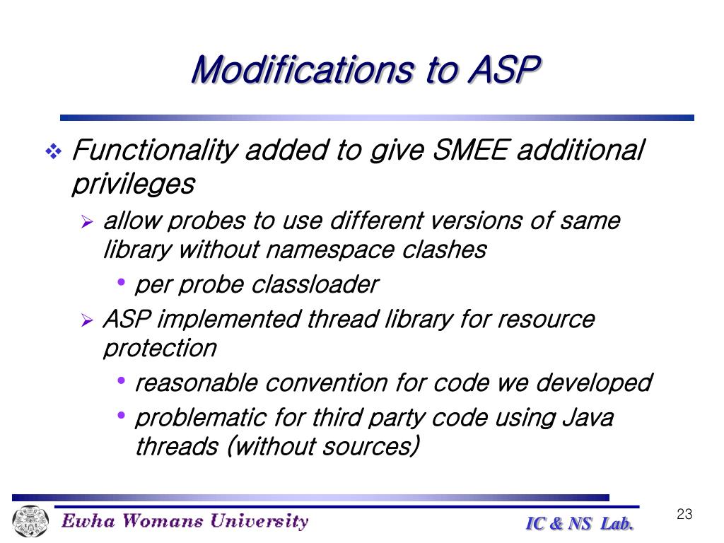 Functionality added to give SMEE additional privileges allow probes to use different versions of same library without namespace clashes per probe classloader ASP implemented thread library for resource protection reasonable convention for code we developed problematic for third party code using Java threads (without sources) Modifications to ASP