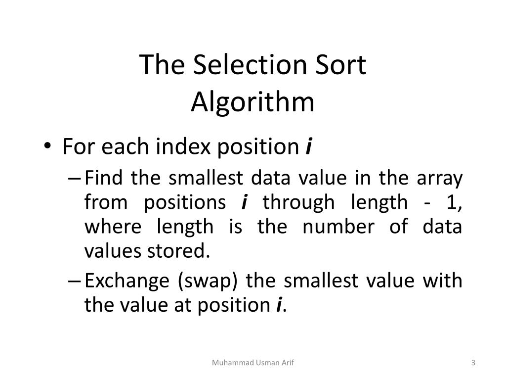 The Selection SortAlgorithm • For each index position i • Find the smallest data value in the array from positions i through length - 1, where length is the number of data values stored. • Exchange (swap) the smallest value with the value at position i. Muhammad Usman Arif