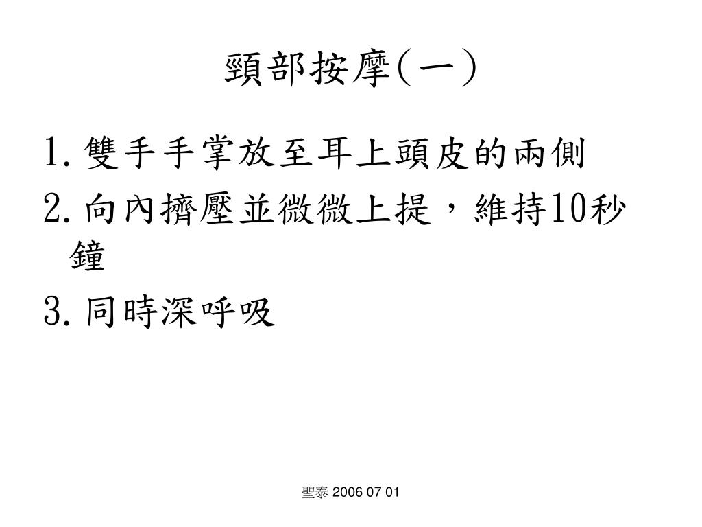 頸部按摩(一) 1.雙手手掌放至耳上頭皮的兩側 2.向內擠壓並微微上提,維持10秒鐘 3.同時深呼吸 聖泰 2006 07 01