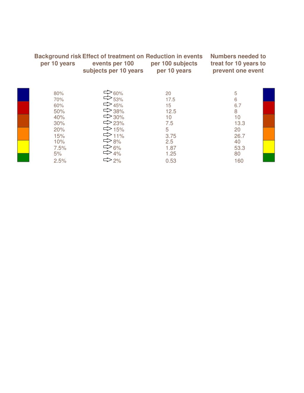 70% 60% 50% 40% 30% 20% 15% 10% 7.5% 5% 2.5% Background risk per 10 years Effect of treatment on events per 100 subjects per 10 years Reduction in events per 100 subjects per 10 years Numbers needed to treat for 10 years to prevent one event 80% 60% 20 5 53% 17.5 6 45% 15 6.7 38% 12.5 8 30% 10 10 23% 7.5 13.3 15% 5 20 11% 3.75 26.7 8% 2.5 40 6% 1.87 53.3 4% 1.25 80 2% 0.53 160