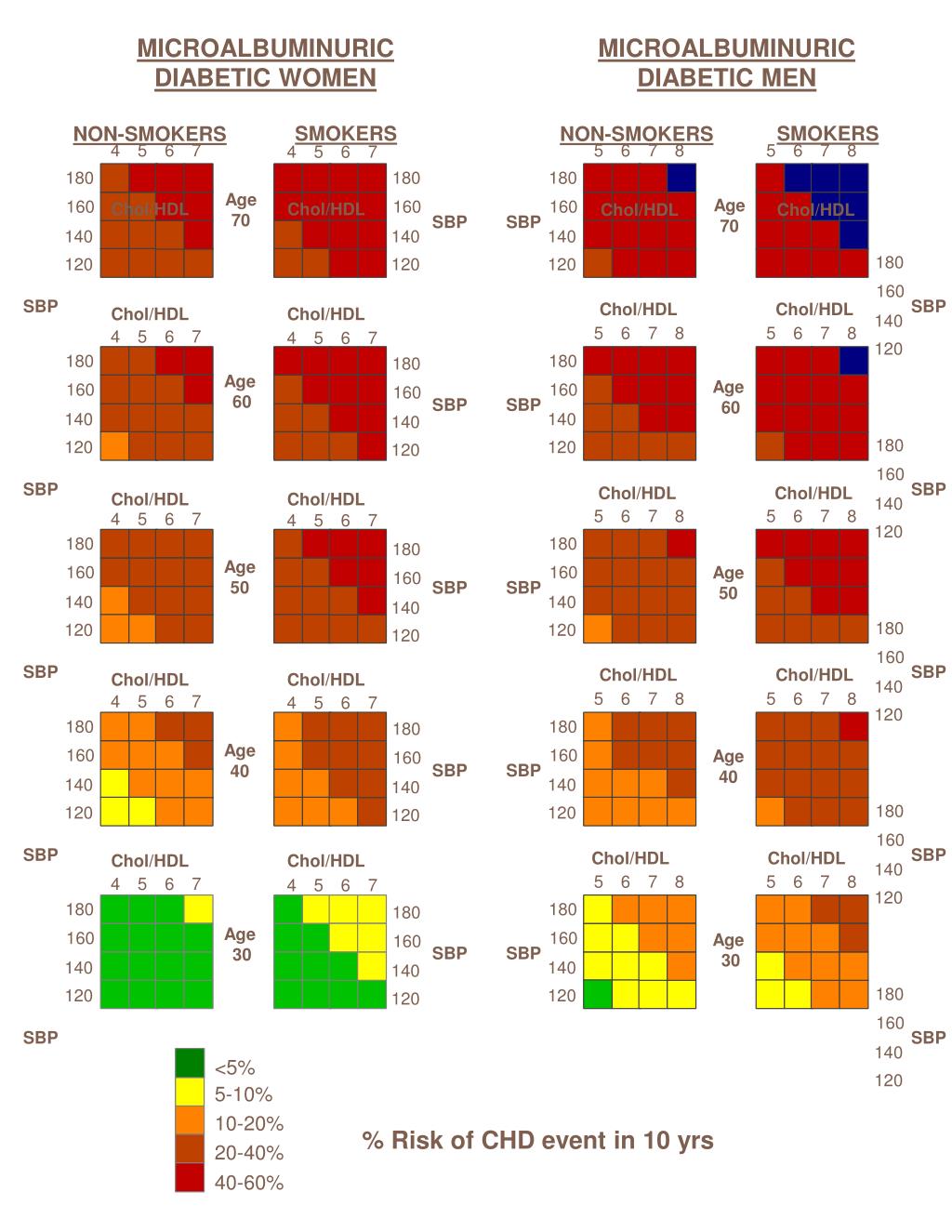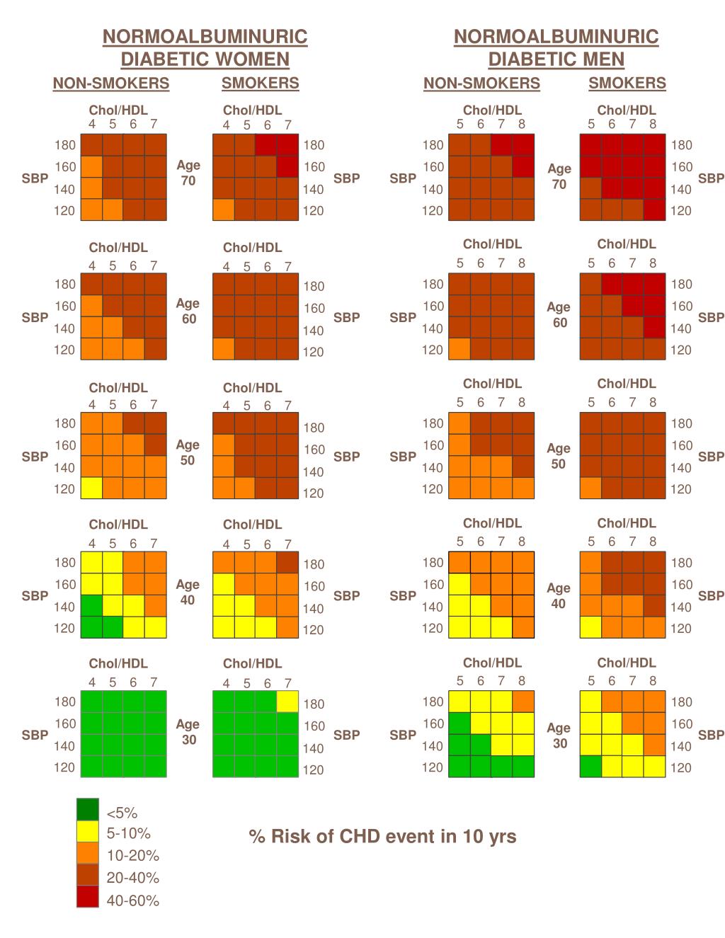 Chol/HDL Chol/HDL Chol/HDL Chol/HDL Age 70 Age 70 Chol/HDL Chol/HDL Chol/HDL Chol/HDL Age 60 Age 60 Chol/HDL Chol/HDL Chol/HDL Chol/HDL Age 50 Age 50 Chol/HDL Chol/HDL Chol/HDL Chol/HDL Age 40 Age 40 Chol/HDL Chol/HDL Chol/HDL Chol/HDL Age 30 Age 30 Chol/HDL Chol/HDL NORMOALBUMINURIC DIABETIC MEN NON-SMOKERS NON-SMOKERS SMOKERS SMOKERS 4 5 6 7 5 6 7 8 5 6 7 8 4 5 6 7 180 180 180 180 160 160 160 160 SBP SBP SBP SBP 140 140 140 140 NORMOALBUMINURIC DIABETIC WOMEN 120 120 120 120 5 6 7 8 5 6 7 8 4 5 6 7 4 5 6 7 180 180 180 180 160 160 160 160 SBP SBP SBP SBP 140 140 140 140 120 120 120 120 5 6 7 8 5 6 7 8 4 5 6 7 4 5 6 7 180 180 180 180 160 160 160 160 SBP SBP SBP SBP 140 140 140 140 120 120 120 120 5 6 7 8 5 6 7 8 4 5 6 7 4 5 6 7 180 180 180 180 160 160 160 160 SBP SBP SBP SBP 140 140 140 140 120 120 120 120 5 6 7 8 5 6 7 8 4 5 6 7 4 5 6 7 180 180 180 180 160 160 160 160 SBP SBP SBP SBP 140 140 140 140 120 120 120 120 <5% 5-10% % Risk of CHD event in 10 yrs 10-20% 20-40% 40-60%