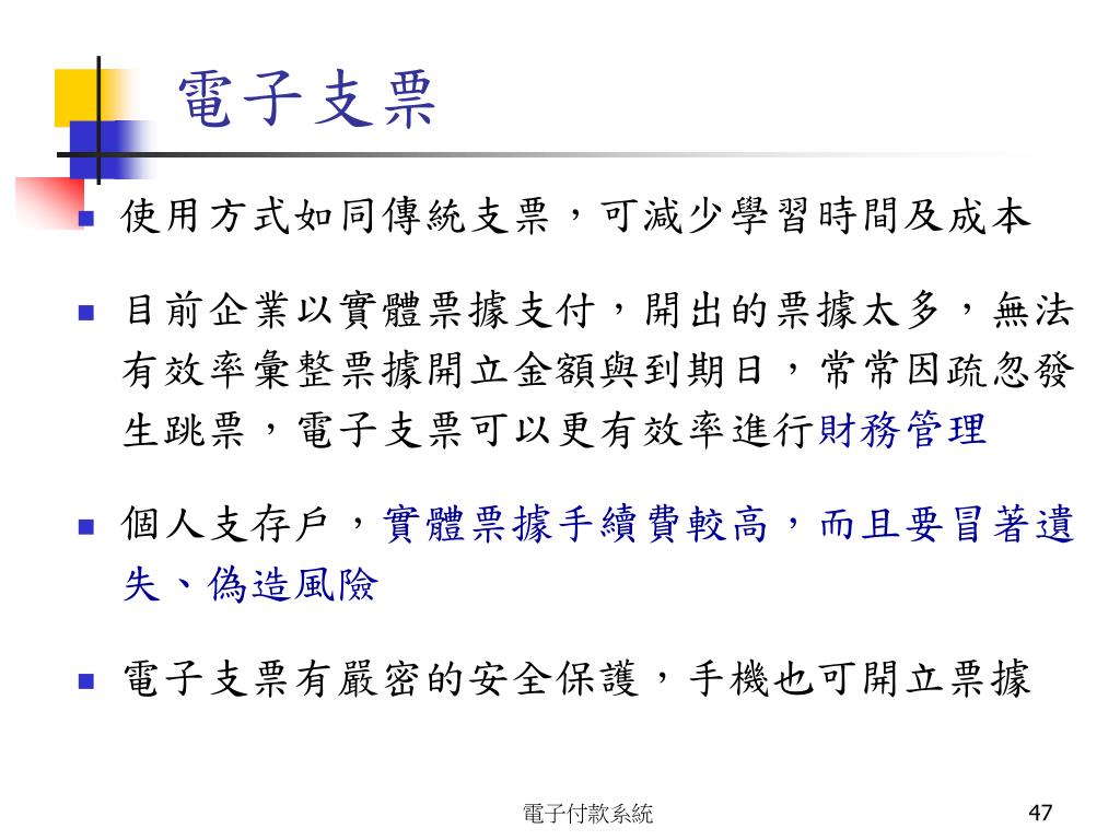 電子支票 • 使用方式如同傳統支票,可減少學習時間及成本 • 目前企業以實體票據支付,開出的票據太多,無法有效率彙整票據開立金額與到期日,常常因疏忽發生跳票,電子支票可以更有效率進行財務管理 • 個人支存戶,實體票據手續費較高,而且要冒著遺失、偽造風險 • 電子支票有嚴密的安全保護,手機也可開立票據 電子付款系統