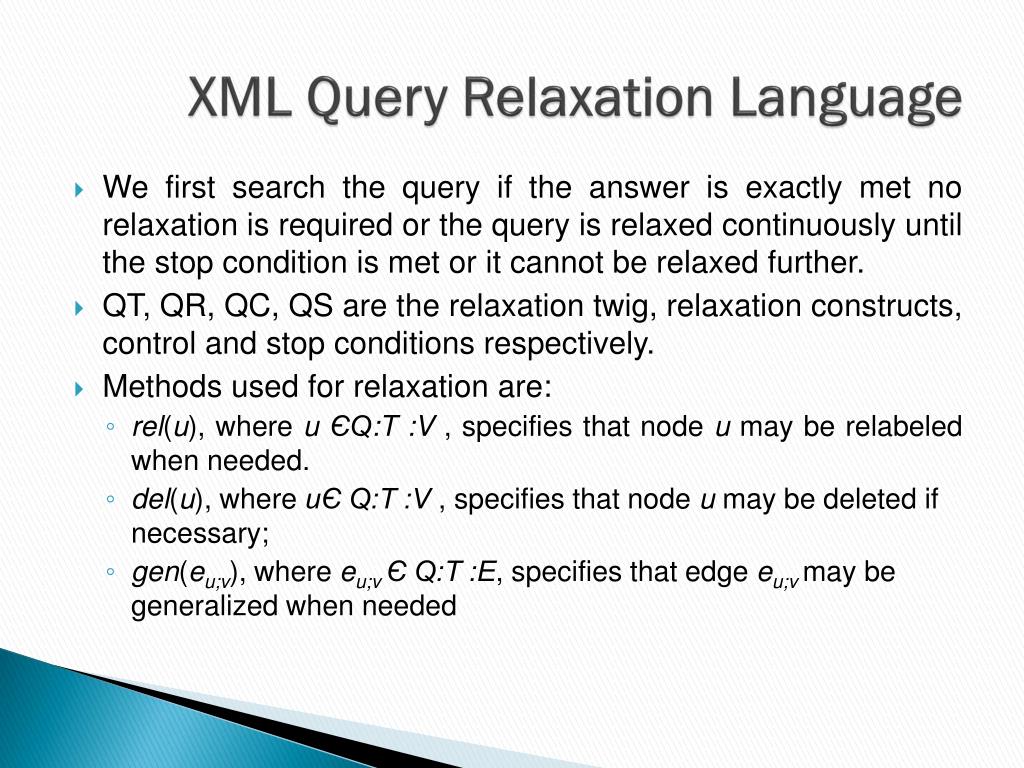 XML Query Relaxation Language • We first search the query if the answer is exactly met no relaxation is required or the query is relaxed continuously until the stop condition is met or it cannot be relaxed further. • QT, QR, QC, QS are the relaxation twig, relaxation constructs, control and stop conditions respectively. • Methods used for relaxation are: • rel(u), where u ЄQ:T :V , specifies that node u may be relabeled when needed. • del(u), where uЄ Q:T :V , specifies that node u may be deleted if necessary; • gen(eu;v), where eu;v Є Q:T :E, specifies that edge eu;v may be generalized when needed