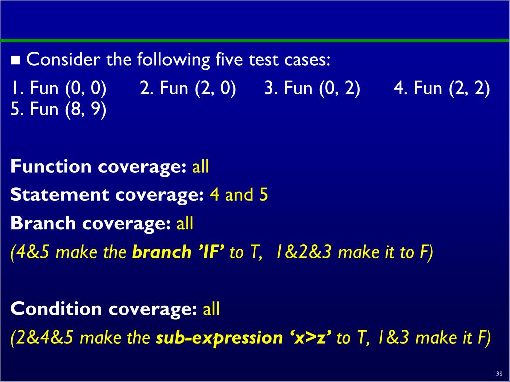 Consider the following five test cases: 1. Fun (0, 0) 2. Fun (2, 0) 3. Fun (0, 2) 4. Fun (2, 2) 5. Fun (8, 9) Function coverage: all Statement coverage: 4 and 5 Branch coverage: all (4&5 make the branch ’IF’ to T, 1&2&3 make it to F) Condition coverage: all (2&4&5 make the sub-expression ‘x>z’ to T, 1&3 make it F)