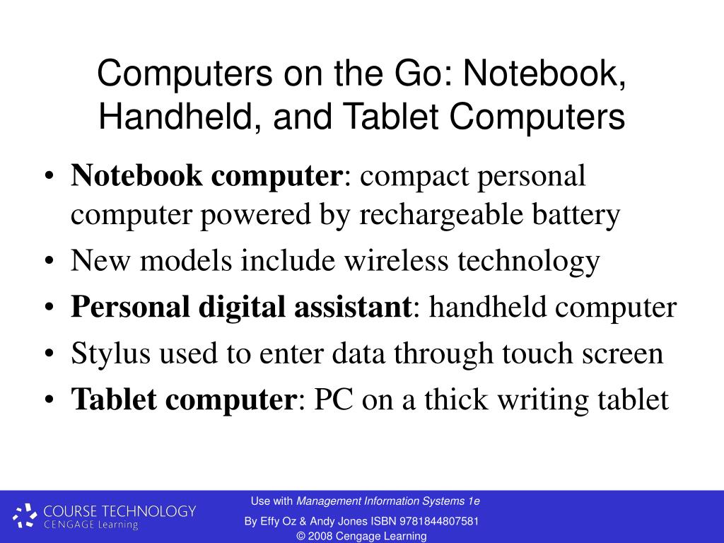 Computers on the Go: Notebook, Handheld, and Tablet Computers • Notebook computer: compact personal computer powered by rechargeable battery • New models include wireless technology • Personal digital assistant: handheld computer • Stylus used to enter data through touch screen • Tablet computer: PC on a thick writing tablet