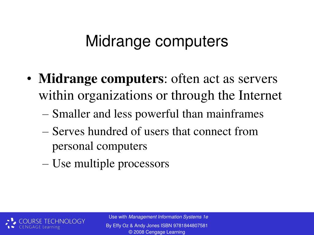 Midrange computers • Midrange computers: often act as servers within organizations or through the Internet • Smaller and less powerful than mainframes • Serves hundred of users that connect from personal computers • Use multiple processors