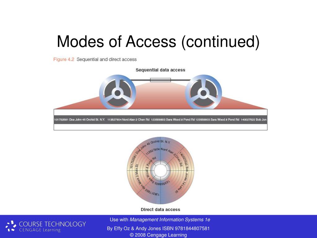 Modes of Access • Sequential storage: data is organized one record after another • Slower and less convenient • Direct access: records are organized by physical address on the device • Flash drives: small storage devices that connect via universal serial bus • Direct access storage media is only practical way to organize and query databases