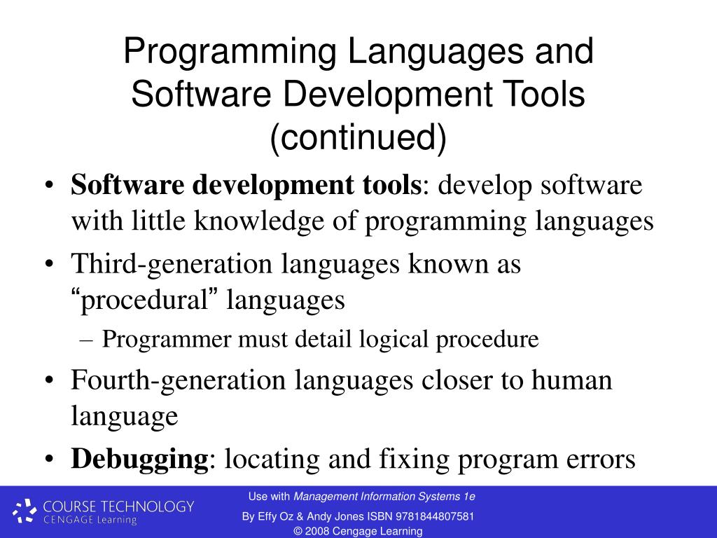 Programming Languages and Software Development Tools (continued) • Software development tools: develop software with little knowledge of programming languages • Third-generation languages known as “procedural” languages • Programmer must detail logical procedure • Fourth-generation languages closer to human language • Debugging: locating and fixing program errors