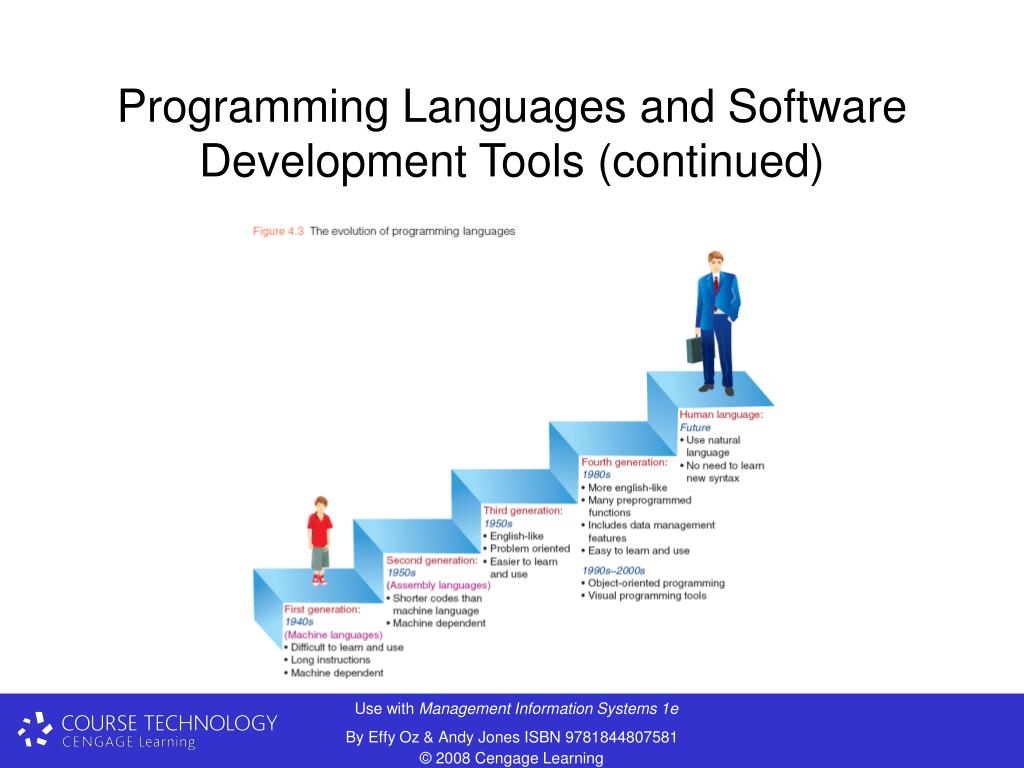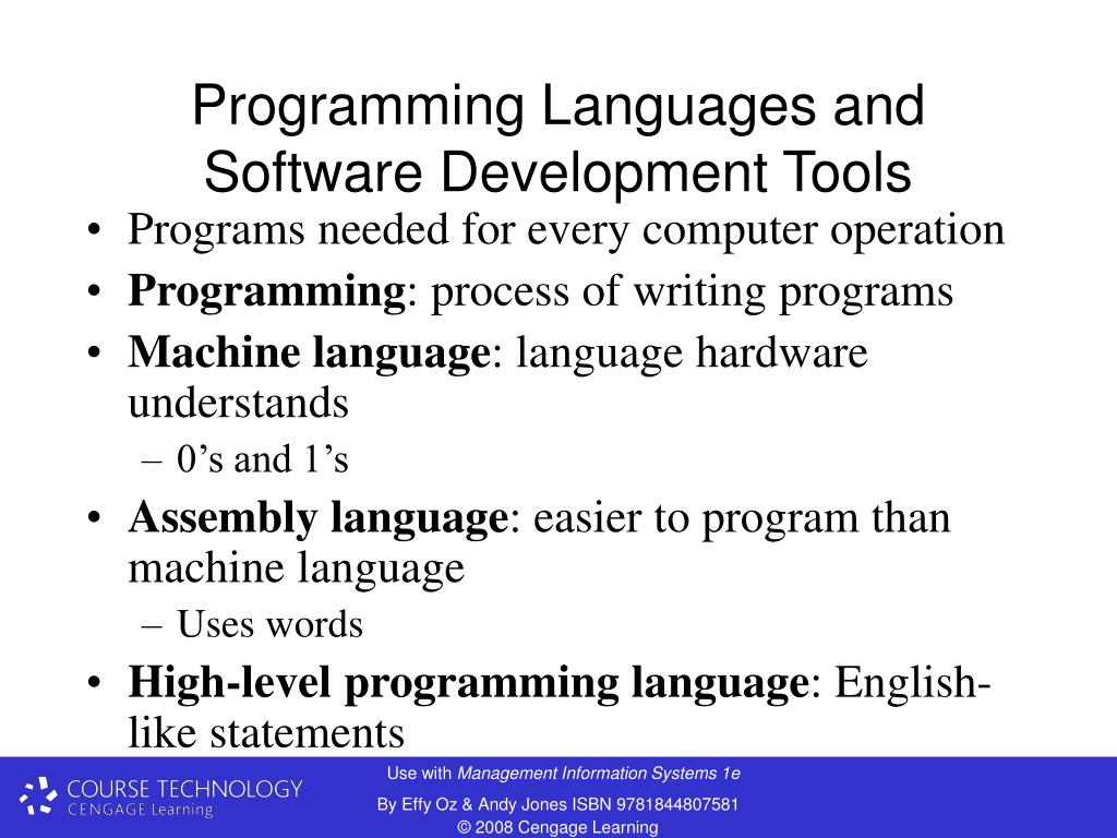 Programming Languages and Software Development Tools • Programs needed for every computer operation • Programming: process of writing programs • Machine language: language hardware understands • 0’s and 1’s • Assembly language: easier to program than machine language • Uses words • High-level programming language: English-like statements