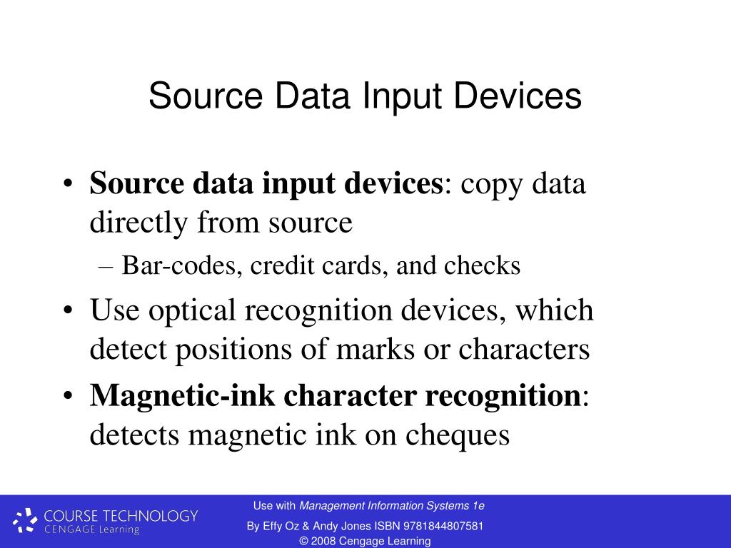 Source Data Input Devices • Source data input devices: copy data directly from source • Bar-codes, credit cards, and checks • Use optical recognition devices, which detect positions of marks or characters • Magnetic-ink character recognition: detects magnetic ink on cheques