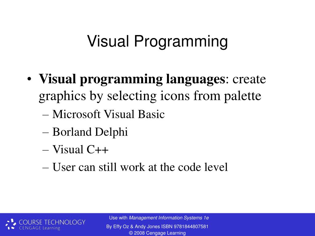 Visual Programming • Visual programming languages: create graphics by selecting icons from palette • Microsoft Visual Basic • Borland Delphi • Visual C++ • User can still work at the code level