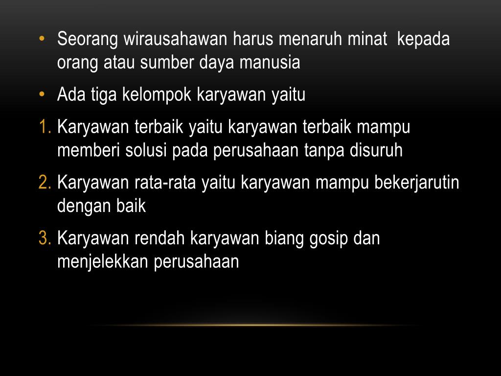 SeorangwirausahawanharusmenaruhminatkepadaorangatausumberdayamanusiaSeorangwirausahawanharusmenaruhminatkepadaorangatausumberdayamanusia • Adatigakelompokkaryawanyaitu • Karyawanterbaikyaitukaryawanterbaikmampumemberisolusipadaperusahaantanpadisuruh • Karyawan rata-rata yaitukaryawanmampubekerjarutindenganbaik • Karyawanrendahkaryawanbianggosipdanmenjelekkanperusahaan