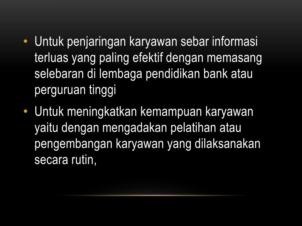 Untukpenjaringankaryawansebarinformasiterluas yang paling efektifdenganmemasangselebarandilembagapendidikan bank atauperguruantinggi • Untukmeningkatkankemampuankaryawanyaitudenganmengadakanpelatihanataupengembangankaryawan yang dilaksanakansecararutin,