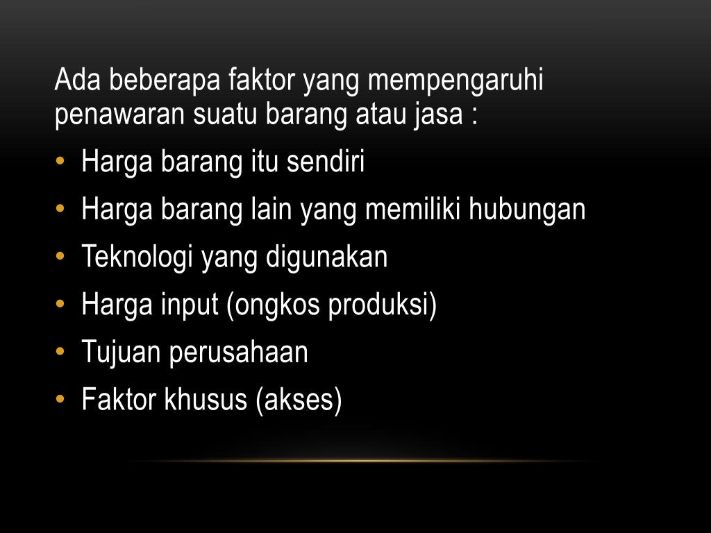 Ada beberapafaktor yang mempengaruhipenawaransuatubarangataujasa: • Hargabarangitusendiri • Hargabarang lain yang memilikihubungan • Teknologi yang digunakan • Harga input (ongkosproduksi) • Tujuanperusahaan • Faktorkhusus (akses)