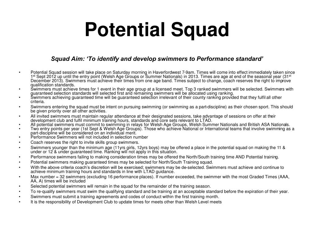 Potential Squad Changes • Selection will be for squad will be for remainder of season but entry points are the same, i.e. any swimmer qualifying during the season will remain until August provided they maintain training standards. • Multisport athletes will not affect the ranking for selection of swimmers for potential group as they will not be included in the ranking. However, multisport athletes must still be within the top 3 ranking or make guaranteed time to gain access to training. • It is vital that these swimmers represent Pembrokeshire at a regional/county level. Therefore it is mandatory that all ‘Potential’ athletes qualify, enter and swim the West Wales Championships. Swimmers who do not meet this element for any reason other than illness or injury will be de-selected. • Swimmers under the age of 14yrs who do not take up the provision of mid-week morning training will not be invited. • Times will be selected from Level 2 Licensed meets and above.